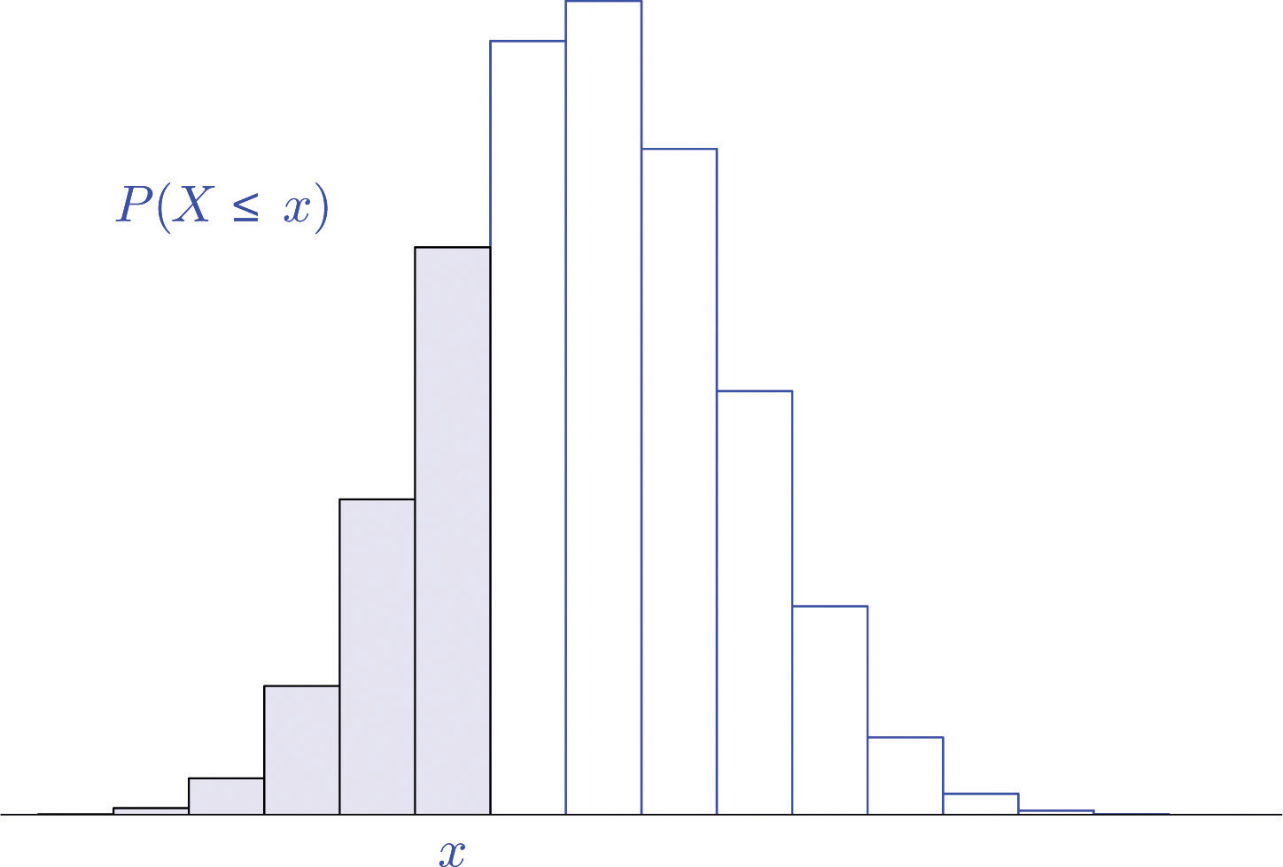 P(X≤x)=P(0)+P(1)+ · · · +P(x)This is illustrated in Figure 4.6 "Cumulative Probabilities". The probability entered in the table corresponds to the area of the shaded region. The reason for providing a cumulative table is that in practical problems that involve a binomial random variable typically the probability that is sought is of the form P(X≤x) or P(X≥x). The cumulative table is much easier to use for computing P(X≤x) since all the individual probabilities have already been computed and added. The one table suffices for both P(X≤x) or P(X≥x) and can be used to readily obtain probabilities of the form P(x), too, because of the following formulas. The first is just the Probability Rule for Complements.